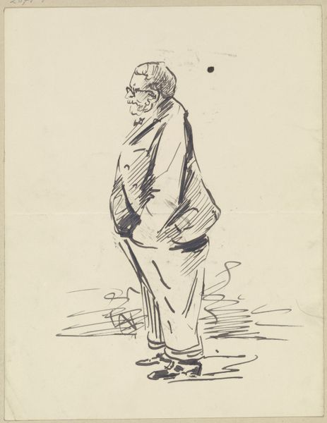 Curator: I must say, there’s something delightfully wicked about this caricature. The single line describing the monocle... almost cruel! Editor: Yes! Wicked in a knowing way, perhaps. We're looking at "Caricature of a Man Wearing a Monocle Seen in Profile," an ink drawing from between 1880 and 1900 currently residing here at The Met. The artist, regrettably, remains anonymous. Curator: The anonymity feels right somehow. As if the commentary comes from everywhere and nowhere, simultaneously. What does a monocle signify in that era, beyond wealth and perhaps a certain detachment? It distorts vision, offers a focused, curated reality. Editor: Precisely. Think of the rising middle class mimicking aristocratic affectations. A monocle becomes shorthand for aspiration and social posturing, but the artist seems to deflate that entirely, reducing the figure to almost pure contour. The stark lines suggest judgment. Curator: Look at how the nose and brow protrude! It amplifies a perceived self-importance and hints at something…intellectual pretension? Do you think there's a commentary on the increasing emphasis of 'expertise' and specialized knowledge around that time? Editor: Definitely a skewering of intellectual elitism, perhaps in reaction to professional guilds asserting social power in the late 19th century. A 'look at me and my advanced degree' rendered completely absurd. A drawing of the kind you might find circulating in pamphlets or biting journals in fin-de-siecle Paris or Vienna. Curator: It is visually immediate and incisive! It bypasses any sympathetic reading entirely. So, in a single, flowing stroke the artist subverts authority. It makes one wonder... who might this man represent to that society? Editor: Possibly someone of considerable power, vulnerable to such ridicule precisely because they were emblematic of wider socio-political dynamics. I like how this drawing functions. It reminds me of Honoré Daumier and his savage commentaries about class pretension and moral failings during France's July Monarchy. Curator: Thank you for situating it for us. To me, the symbolism within is about power, access to education, seeing and being seen in a certain light - all vulnerable to swift iconoclastic critique. Editor: Indeed. A pointed jab at the inflated egos of the era, skillfully rendered. We invite our visitors to reflect: who would *they* caricature and *why* today? Curator: Indeed. Something to chew on as they consider other figures and their representations around these galleries!