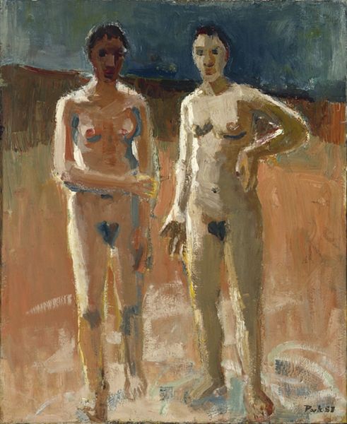 Editor: This is "Am Ufer IV," by Leo Putz, an oil painting. It strikes me as quite… dreamlike, with those hazy colors and figures that almost melt into the background. There's a strange mix of intimacy and detachment in the scene. What catches your eye? Curator: Oh, it's like a half-remembered summer afternoon, isn't it? That shimmering light, the boldness of the brushstrokes – Putz isn't afraid of color. He isn't trying to replicate reality, he's inviting you into a feeling. Notice how the figures almost seem unfinished? As though they are fleeting visions or perhaps they want to exist without expectations and simply just… be? Editor: That makes sense! The unfinished quality adds to that dreamlike atmosphere. The nude figure, though... it feels almost confrontational in contrast to the softer mood. Curator: Ah, but is it confrontational? Or is it a celebration of freedom and connection to the water – in parallel to nature and the self? Putz captures the spirit of the moment rather than trying to paint some hyper-realistic ideal. He’s exploring themes that would have been cutting edge for the time period. Now it begs the question, why did that intrigue Putz so? Editor: Hmmm, interesting. I hadn’t thought of it as a celebration. More of a… well, a stark contrast. But freedom… yes, I see that. Looking closer, that bold application of color gives a kind of ‘joy of life’ element to the painting. Curator: Precisely! The art breathes, feels, moves, doesn’t it? Editor: Absolutely. Thanks for illuminating all of that for me! It shifted my perspective on it quite a bit. Curator: Anytime! Now I’m wondering how Putz’s later works evolved, if he continued exploring those themes. So much more to learn and contemplate…
