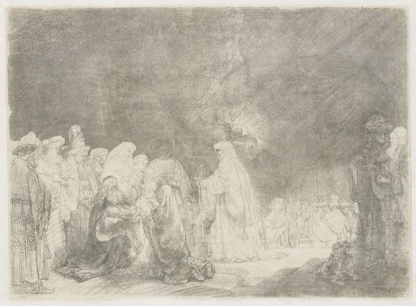 Henri de Groux made this print, 'Menigte aan de rand van een verwoeste stad', using a technique that reminds me of drawing. It’s all about line, tone and the way those marks build up to make an image, like putting charcoal to paper. Look at how the surface is worked. See those scribbly, scratchy lines, almost frantic in their energy? De Groux piles them up to create this dense, shadowy atmosphere, full of emotion. Notice how the artist renders the figures, almost melting into the smoke and rubble around them. The faces are particularly striking; they seem to capture a raw, unfiltered grief. This work brings to mind Käthe Kollwitz, especially in her unflinching portrayals of war and its impact on ordinary people. It's a reminder that art doesn't always have to be beautiful; sometimes, it needs to be a mirror reflecting the harsh realities of the world.