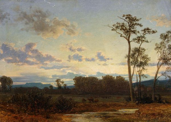 Editor: This is Amaldus Nielsen's "I Vingeråsheia, Telemark," an oil painting from 1866. I find it has such a serene, almost melancholy feel to it, and it appears almost untouched. How do you interpret this work, especially considering the time it was made? Curator: It’s interesting you mention the feeling of untouched nature. The mid-19th century in Norway was a time of burgeoning national romanticism, where artists like Nielsen sought to define a specifically Norwegian identity, distinct from Danish or Swedish influence. Landscape painting played a vital role in constructing this identity. Editor: So the painting becomes more than just a landscape; it's a statement. Curator: Precisely. Think about who was likely viewing this painting: a growing urban middle class eager to connect with the ‘authentic’ Norway they imagined in these rural scenes. It’s also interesting to note the absence of prominent human figures. Why do you think Nielsen chose to represent the landscape in this way? Editor: Perhaps he wanted to emphasize the power and grandeur of nature itself, making it almost a spiritual experience, free from everyday concerns. Or perhaps the inhabitants didn't fit the nationalistic narrative. Curator: A great point! This landscape isn't simply 'nature'; it's carefully constructed imagery designed to evoke specific feelings of national pride and belonging, even if it excludes or idealizes certain aspects of reality. Editor: That’s a really helpful way of looking at it; the social context really does shift my perspective. Thanks! Curator: My pleasure. Thinking about the public role of art always enriches our understanding.