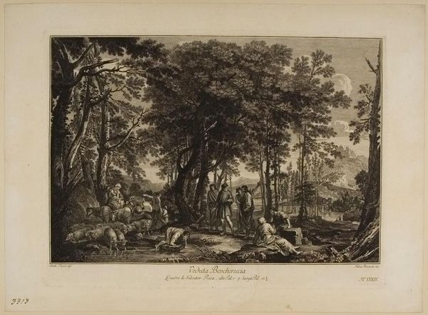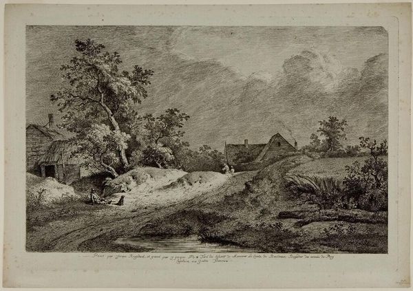 Curator: Jean Jacques de Boissieu's etching, "Landscape with a Cascade and Storm," presents a meticulously rendered scene of nature's drama. What's your initial response to it? Editor: It's brooding, isn't it? Like a charcoal drawing in a fairytale gone wrong. The storm seems almost alive. Curator: Note the artist's use of line. The fine, dense hatching creates tonal variation, structuring depth and atmospheric perspective. Editor: Yet, there is a sort of playful rhythm in the way the artist depicts the water and the tilted trees. It feels alive, ready to pounce, but also kind of inviting. Curator: Indeed, the formal arrangement achieves a tension, a dialectic between the sublime and the picturesque. Editor: It does suggest a wild freedom, doesn't it? I appreciate the artist showing us the beauty in the midst of the chaos. Curator: A fitting observation that captures the essence of Boissieu's evocative landscape. Editor: Yes, something powerful in such detail.