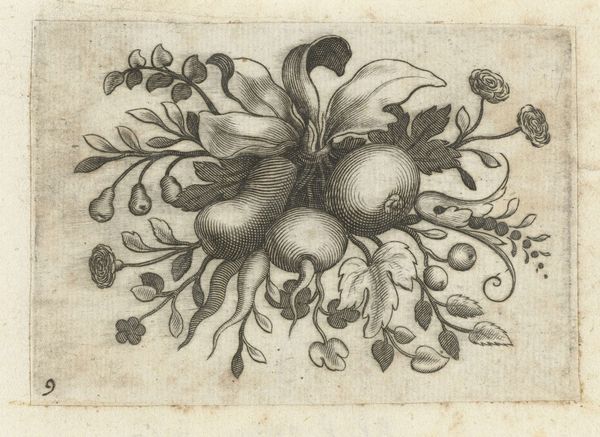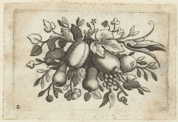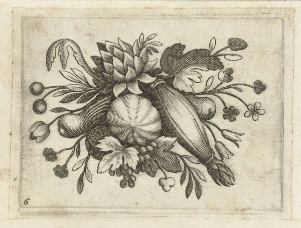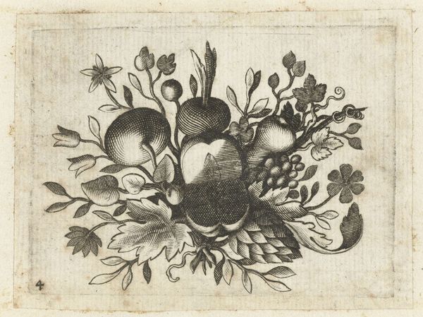 Dietrich Krüger created this print of fruit on a stand, using etching, sometime around the late 16th or early 17th century. The print depicts a selection of fruit and vegetables artfully arranged in a shallow bowl. In the Netherlands, the rise of a wealthy merchant class created a demand for luxury goods and decorative art. Still life paintings, with their detailed depictions of everyday objects, became increasingly popular. They were collected, displayed, and traded. The fruit and flowers, arranged on a simple stand, suggest both abundance and prosperity. The print could have been used as a model for other artists to copy or as a decorative element in its own right. To understand this work, we might consult historical cookbooks and botanical illustrations to learn more about the varieties of fruits and vegetables depicted and the symbolic associations they might have carried at the time. This etching reflects a society that was increasingly focused on the material world and the pleasures of the senses.
