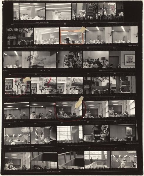 Robert Frank made this contact sheet, “From the bus 28”, by pressing his negatives onto a sheet of photographic paper and exposing it to light. It's like he's showing us his working process, his way of seeing as a constant flow. The image is raw, unedited – we see the full strips of negatives, with all the marks, scratches, and imperfections. Look at how the light and shadow play across the surface, how the grit and grain of the film add to the texture. It’s not just about the subject matter, but about the feel of the city, the dirt and the energy. The red square around a frame hints at a moment he wanted to come back to, but everything here is a document of the spontaneous, the ephemeral. Like Garry Winogrand, Frank caught life as it happened, but with a bleaker, more personal edge. It's less about capturing a perfect image and more about the act of seeing, the journey of making art.