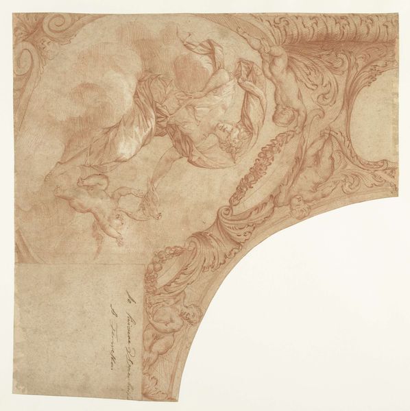 Curator: This delicate rendering in pencil offers a glimpse into the baroque. This is Mattheus Terwesten's, "Design for a corner piece of a ceiling with Vertumnus and Pomona," created sometime between 1680 and 1757. It's held at the Rijksmuseum. Editor: My first impression is one of lightness and asymmetry, an ephemeral narrative. The red chalk medium adds to its dreamlike quality. How would this design have functioned in its intended context? Curator: Well, Vertumnus and Pomona represent the changing seasons and abundance, embodying themes that rulers liked to project; Terwesten’s choice suggests prosperity and divine favor. Think of it as an opulent stage. What’s really interesting here is how this sketch reveals academic ideals about love, wealth, and leisure as tools to reinforce elite ideology. Editor: So, art functioning as soft power? The idealized forms, though—they seem frozen, disconnected from everyday struggles. Does this vision truly represent the lives of the people under such rule? The piece itself as almost a symbolic barrier or high gate. Curator: Indeed. The classical figures—notice Pomona's cascading drapery and Vertumnus's shepherd's staff— speak to a desire for timeless authority, reminiscent of classical myth, echoing motifs of a golden age, which has a resonance for power-brokers even today. Editor: It strikes me that a visual language that prioritizes such classical figures might serve to silence other narratives and identities. Who gets to participate in this abundance, and who is excluded? It feels crucial to address the inherent biases within these historical representations. Curator: I can certainly see how these representations project the interests of specific people who controlled visibility, like how royal families used marriage rites, masquerades, and diplomatic visits. They offer some crucial keys into understanding historical and cultural memory. Editor: True. Analyzing these choices is important because visual representations create what's acceptable in any age. These archetypes have served as cultural currency even into today. Thank you. I feel this conversation made the dynamics more relevant.