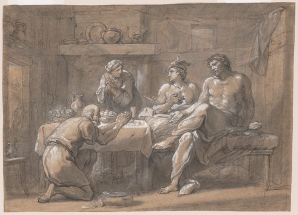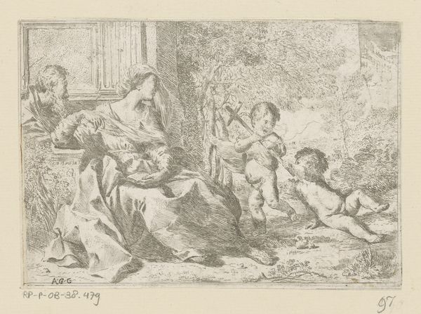 Editor: We’re looking at "Huiselijk tafereel met kind aan de borst," a 17th-century etching, likely made between 1629 and 1670. It feels crowded, but also intimate, depicting a mother breastfeeding amidst a bustling scene of children and onlookers. What do you see in this piece, considering its historical context? Curator: I see a visual document embedded in complex societal power dynamics. The Dutch Golden Age, despite its economic prosperity, rigidly defined gender roles. This image, while seemingly a benign domestic scene, participates in constructing the ideal of motherhood: selfless, nurturing, and existing within the confines of the home. Editor: That’s interesting. I hadn’t thought about it that way. The domestic scene is so central, how would one perceive its relation with the male figures at windows, peering down? Curator: Exactly. Consider the gaze. Who is looking at whom and why? Those figures peering in become complicit in framing and observing a specific notion of the domestic space and gendered behavior within it. The seemingly casual arrangement reinforces this carefully constructed tableau for public consumption, in effect defining and regulating motherhood. Are the other people family or outside viewers, are they welcome or intrusive, and are they even men? What details lead you to see the peering figures as male? Editor: I’m inferring their gender through clothing. Now I’m not sure that I would define it as ideal representation or as simple as portraying everyday life of people and children? Curator: And that is precisely what makes it potent: it normalizes specific roles, erasing other possibilities. How might this image be different if rendered by a woman of the period? What voices are absent? Understanding the intersection of art and societal structures enables us to critique even seemingly straightforward imagery. Editor: I see, considering those layers makes the artwork much more significant than it appears at first glance. Curator: Exactly. Recognizing those intersections opens new avenues for interpretation and reveals the true depth of its meaning and what messages society tries to pass down through it.