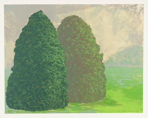 Curator: So, here we have Ivor Abrahams' "Garden Suite IV," currently part of the Tate collection. Editor: Oh, wow, there's something wonderfully unsettling about the hyper-real greens against that stormy sky. Curator: Abrahams often played with idealized landscapes, and here he uses screen printing to emphasize the artificiality. Notice how the repeated dot pattern flattens the space. Editor: Right, the technique transforms the garden into something almost cartoonish, yet there's still a sense of foreboding, like a stage set waiting for a drama to unfold. It's a strange combination. Curator: It's a garden, but not quite. Abrahams’ work prompts us to question our longing for idealized nature. Editor: Well, whatever it is, it's definitely playing with my emotions. Sort of intriguing and a little scary. Curator: Indeed. It’s a space both inviting and oddly isolating.