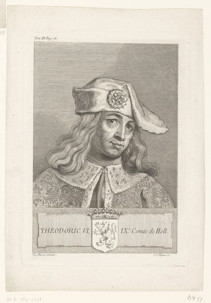 Curator: Before us, we have Cornelis Visscher's 1650 engraving, “Portret van Dirk VI, graaf van Holland,” currently residing at the Rijksmuseum. Editor: The etching creates such an odd, ethereal atmosphere. The way the subject is framed contributes to a striking feeling of disconnection and ambiguity. Curator: Absolutely. Visscher's strength lies in the structural arrangement; the oval frame adorned with floral motifs perfectly contains and contrasts with Dirk VI. Notice the stark heraldic shield below, which acts as a visual anchor, stabilizing the composition. Editor: And the detail in the material rendering is rather fascinating. Consider the labor involved in producing this precise matrix. It is made possible by the network of craftsmen creating the paper, inks and pressing equipment for the printer, an unseen army, rendering it reproducible and democratizing noble representation. Curator: Indeed. And what’s fascinating is the way Visscher uses the etching technique to define the portrait's emotional texture. There's a deliberate choice of line quality, with short, hesitant strokes building up shadow and depth, giving the piece a nervous tension. Editor: Look, you can almost feel the density of the paper and smell the oiliness of the ink, considering all the careful steps in the work. Its physicality offers us a glimpse into 17th-century artisanal practices. Curator: By isolating him in this ornate oval, Visscher encourages us to analyze Dirk VI. Stripped bare of his context, he's transformed into a symbol, ready for structural decoding. Editor: But the material context also transforms the reception. As it moved through early modern urban centers, its meaning was further negotiated by the shopkeepers who sold it, the collectors who archived it, and those who encountered it in daily life. Curator: Well, I suppose the convergence of form and social context presents multiple angles of exploration when interpreting a portrait such as this one. Editor: Exactly, and this type of print helps us investigate art beyond a privileged setting and look instead at its use by, and presence in, early commercial environments.