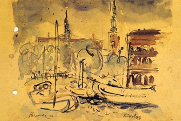 Editor: Here we have Konstantin Gorbatov’s "The Doge's Palace, Venice," painted in 1914 using oil paints. It has such a breezy and reflective ambiance. I find my attention is drawn to how the shapes and colours come together. What do you see in this piece from a formal perspective? Curator: I see a sophisticated manipulation of form and colour designed to evoke a particular emotional response. Note the impasto technique; the thick application of paint lends a tangible texture to the canvas, building form through carefully placed daubs of colour. Consider, also, the limited palette – primarily earthy tones accented by muted blues and reds. This isn't a literal depiction of Venice, but rather a construction of it. How do these stylistic elements affect your understanding? Editor: I think they capture a kind of wistful beauty. The looser brushstrokes soften the details of the Doge's Palace, giving it an ethereal quality. But I wonder if the composition contributes to that as well? Curator: Precisely! Examine the placement of the palace itself. Gorbatov deliberately obscures the architectural details, contrasting with the boats in the foreground, doesn't he? What sort of relationship do you see forming between the two through that distinction? Editor: It creates a dynamic tension between near and far, tangible and intangible. The painting isn't about precise architectural details; it prioritizes a sense of place and atmosphere. I like how you explained his manipulation of form and color! Curator: And I appreciate your close observation on the relationship between tangible form and spatial perspective. Considering the structural elements of the composition provides insights that might be overlooked.