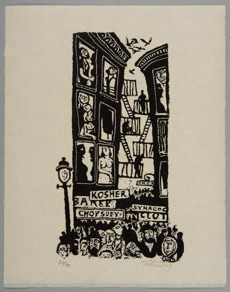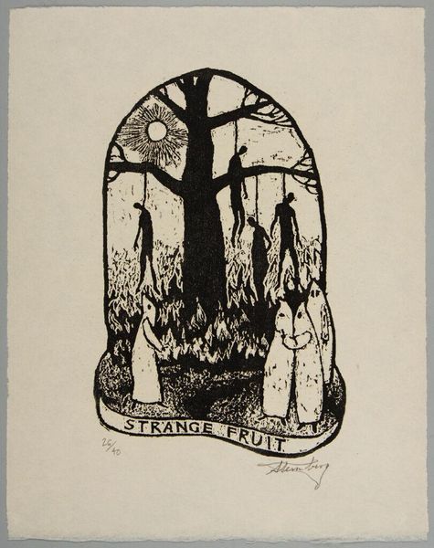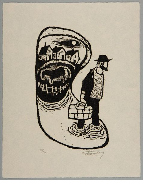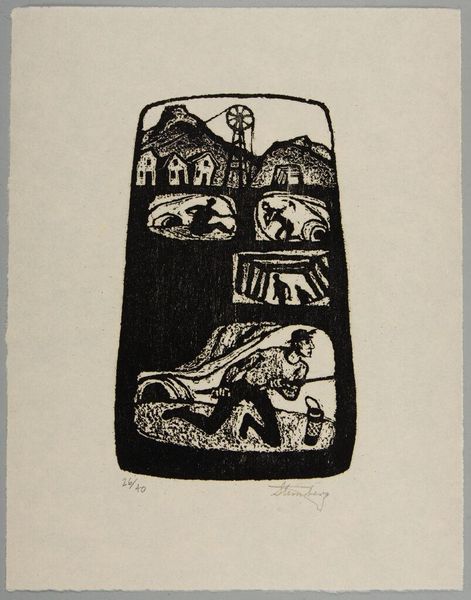 Curator: Here we have Harry Sternberg's "Drawing in the Desert," a stark black and white print. It evokes an immediate feeling of heat and desolation, wouldn't you agree? Editor: Absolutely. The composition is quite striking, almost a visual paradox—the sharp, defined edges contrast with the implied vastness of the desert landscape. Curator: Note the roadrunner and rattlesnake in the foreground. These desert creatures often symbolize resilience and danger, reflecting the harsh realities of survival. Editor: And the figure sketching in the distance… a human attempting to capture that very landscape. The layers of representation at play are fascinating. Curator: Consider how the sun, rendered as a burst of lines, acts almost as a watchful eye, a constant presence in the unforgiving terrain. Editor: The entire piece oscillates between abstraction and representation, inviting us to consider not just what we see, but how we see. Curator: This print leaves me pondering the artist’s relationship to this landscape and the stories it holds. Editor: Yes, I leave seeing the dynamism that formal choices bring into the composition and affect the reading.