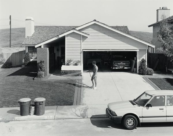 Editor: So this is Joe Deal’s “Sunning, Country Village, California” from 1984, a black and white photograph. What strikes me is the kind of staged, almost surreal feel to this typical suburban scene. What's your take? Curator: There's a quiet disruption at play, isn't there? The careful staging you mentioned amplifies the symbols: the inflatable pool, the mountains beyond, the open garage. Do you see a deliberate visual tension between the home as sanctuary and the encroaching landscape, almost daring to merge with it? Editor: I think so, yes! The house is very… angular and defined, while the mountains seem softer, more yielding. How do you think that tension informs our reading of the photograph? Curator: Consider how this image invites us to reflect on the myth of the American Dream. Look at the family unit staged within the space of consumerism and consider the wider mythology. Deal seems interested in exposing a very contemporary sense of the constructed world. Do you think that’s intentional? Editor: I think so. The black and white really distills everything, stripping away the colors that might distract, highlighting forms and composition, underlining the staged feeling we spoke about. Is he trying to offer a broader social commentary? Curator: Perhaps it’s not as overt as direct commentary, but certainly, by documenting this fabricated landscape with a detached eye, Deal invites a re-examination of our contemporary lives and constructed memories, highlighting the cultural anxieties lurking within what seems like an ideal scene. It makes one wonder, what ideals do we hold now? Editor: Absolutely. The cultural weight of what's absent - perhaps economic security, maybe an older, simpler lifestyle - seems really amplified here. I definitely look at it differently now. Curator: As do I, with a fresh eye, seeing the enduring, evolving tapestry of cultural identity and collective memory woven into even the most seemingly ordinary scenes.