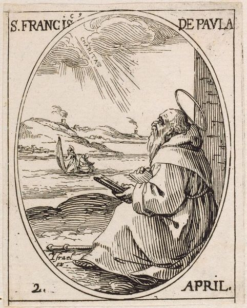 Curator: Let's discuss Jacques Callot's small print, "Saint Felix". Editor: It's a bit macabre, no? That body lying amongst what looks like snails... I sense a somber, almost unsettling mood. Curator: Indeed. Note the precise engraving, the intricate lines creating depth and texture in such a confined space. The composition, encased in an oval, directs our gaze systematically. Editor: And that eagle swooping down – a divine intervention of sorts? The light beams definitely suggest that. Curator: Precisely. The ascending eagle and the supine figure create a dynamic tension, a visual dichotomy between the earthly and the divine. Editor: It makes one think about mortality, and how even in death, there's a connection to something beyond our tangible world. Curator: A fitting contemplation sparked by Callot's masterful control of line and form. Editor: A stark reminder, beautifully rendered.