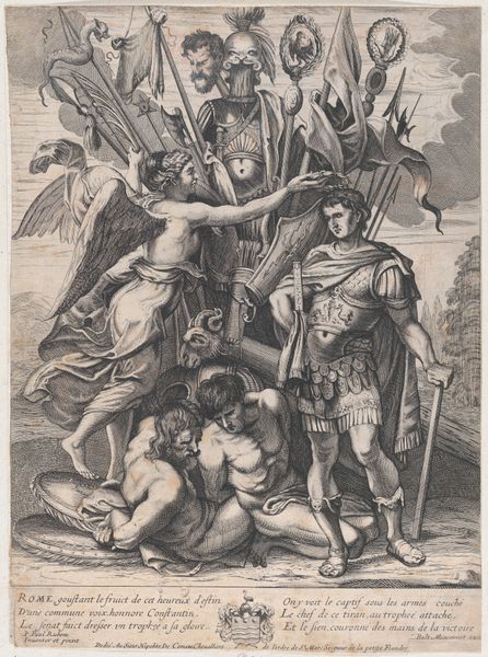 Editor: Here we have "Joshua bidding the sun to stand still," an engraving by Hieronymus Ferroni, dating roughly between 1705 and 1730. I am really struck by the dramatic use of line and the sense of implied movement. How would you interpret this print? Curator: I see the meticulous detail achieved through the engraving process. Consider the labor invested in creating this print; each line meticulously etched, not merely depicting a biblical scene, but also serving as a testament to the craftsman's skill and the social value placed on detailed replications of historical events for broad dissemination and, indeed, ideological impact. What relationship exists between manual skills and religious narrative in this piece? Editor: I suppose it elevates the importance of the story… almost legitimizes it through the demonstration of craft? Do you think the act of mechanically reproducing it has an impact? Curator: Absolutely. The reproduction diminishes the aura, perhaps, but then we ask: whose aura, and to what end? Printmaking makes images like these accessible to wider audiences than paintings, influencing a population and driving sales through dissemination. How does this change of consumption affect traditional ideas of artistry? Editor: That's fascinating. I hadn't considered the commercial and political context of the engraving itself as a material object, just the subject matter. So the method of creation almost *becomes* part of the meaning. Curator: Precisely! And by understanding that context, we challenge hierarchical views on skill, originality, and accessibility in relation to art. We may move beyond an image’s subject to what role materiality performs in producing and spreading narratives. Editor: This reframes how I approach artworks. It pushes me to consider not just the “what” but also the “how” and “why” of its creation and consumption.