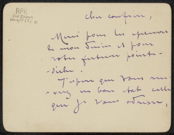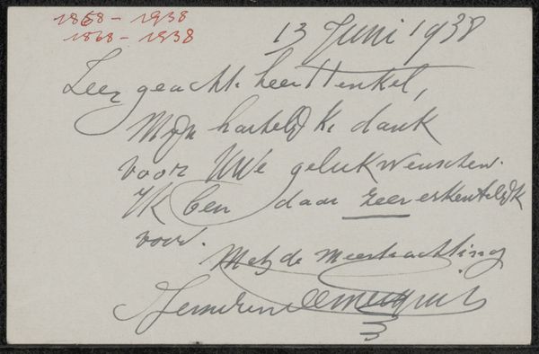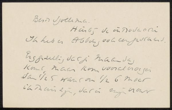 Editor: So, this is Richard Nicolaüs Roland Holst’s "Prentbriefkaart aan Joop Sjollema," dated sometime between 1910 and 1938. It's a drawing in ink on paper. I find it really intriguing how the handwriting itself becomes the artwork, almost like calligraphy but with a personal touch. What stands out to you when you look at this piece? Curator: It's fascinating, isn't it? Think of handwriting as a fingerprint of the soul. This isn't just a message; it’s a carefully constructed visual artifact. Consider the weight each stroke carries – each letter a symbol loaded with intention, revealing a kind of cultural intimacy accessible to the recipient. What do you make of the flow and pressure within the lines? Editor: I notice how the ink varies in thickness. Some parts are darker and bolder, while others are very light, creating a sense of depth and rhythm, but what’s interesting about this rhythm is that it also communicates meaning through the rise and fall of the words. It feels really immediate and human. Curator: Precisely! The very act of hand-lettering elevates the message from mere information to something more emotionally resonant. What's the emotional association you sense between sender and intended reader? Editor: Maybe, familiarity? Knowing that someone took their time to write it, and that there are these little variations that reflect their hand and mood is something precious and vulnerable. Curator: You’ve touched on something essential. It evokes a powerful contrast with today's digital communications. What has been lost in the transition from ink and paper to digital font? Editor: The individuality, definitely. And this tangible connection, like a physical manifestation of thought. It really makes you appreciate how much intention could be conveyed through something as simple as handwriting. Curator: Indeed, each curve, each flourish becomes a carrier of cultural memory and personal narrative, enriching the message in ways a typed font never could. I think I may write my mother!