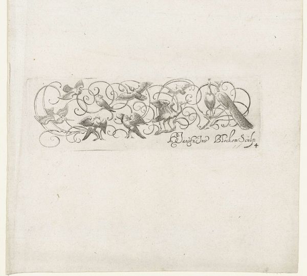 This is a print made by Bartholomeus van Lochom in the 17th century, featuring thirteen birds perched along stylized vines. Birds, throughout art history, have soared as symbols of the soul, freedom, and divine messengers. These birds, nestled amongst the twisting vines, evoke a sense of life's interconnectedness, how we are all supported by the same roots. This motif has flown through time, echoing in ancient Egyptian art, where birds carried souls to the afterlife, and in medieval tapestries, where they symbolized earthly paradise. Consider how the vines, reminiscent of the Tree of Life, wind and support the birds, their presence deeply embedded in our collective memory. This image, like a recurring dream, touches on our subconscious longing for harmony, our innate desire to be part of something larger. The artwork taps into a powerful, almost primal emotional state, engaging our deep-seated hopes and fears. Observe how the symbolism of the bird has evolved, appearing not only in the sacred arts of antiquity, but also recurring in modern emblems representing peace and freedom. These birds echo through history, their songs evolving in different cultural contexts.