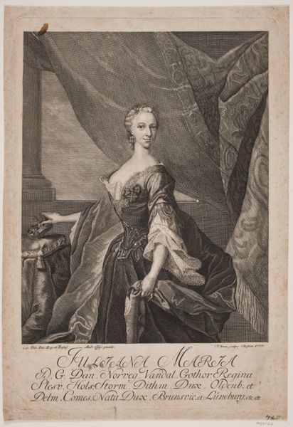 Curator: Before us we have John Faber the Younger’s "Portrait of Mary Howard," an engraving likely created between 1726 and 1756. Editor: It exudes a cool elegance, almost aloof. The texture rendered in the dress suggests a shimmering weight. Curator: Observe how Faber masterfully uses line and shading to model Mary Howard’s figure, note how light glints off the fabric and creates volume through chiaroscuro. Editor: It’s the contrast between the meticulous detail of her dress—all that lace!—and the rougher strokes that build up the background that grabs my attention. What inks were readily available? And how was this baroque portrayal of status distributed to a broader public, impacting consumption habits and societal power structures? Curator: Those lines serve to establish pictorial space and lead our eye through the composition, finally resting on her face—the focal point, in sharp detail to enhance her identity as the main subject of attention. The engraver employs conventional baroque symbolism such as drapery and classical backgrounds to ennoble the sitter. Editor: I find myself thinking about the division of labor involved in its creation; how engravers interpreted painters’ intentions for print. How much input did Howard have, versus how much the artist molded her public persona with their material manipulations? The engraver is literally etching a mark of status. Curator: That perspective illuminates fascinating avenues of inquiry, yet it also risks overlooking the intrinsic qualities of Faber's deliberate and visually stimulating portrait. By framing it as pure craft or manufacture we might neglect what remains an accomplished formal exercise. Editor: Perhaps. But considering production expands understanding and appreciation for not only Faber’s individual skill but of artistic economies shaping this image's ongoing legacy, and indeed, her own. Curator: Indeed. It reminds us to analyze the full, visually dynamic experience and interpret the deeper aesthetic concepts and techniques. Editor: Absolutely. This piece provokes questions extending far beyond initial elegant surfaces—or their carefully manufactured representations.