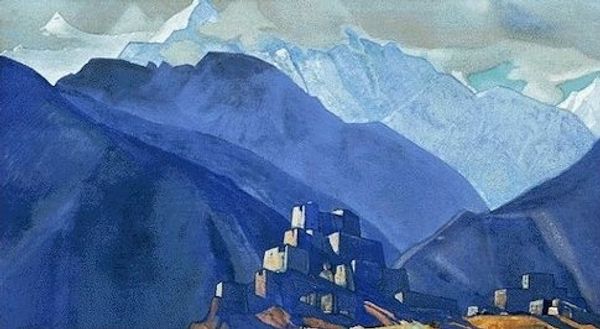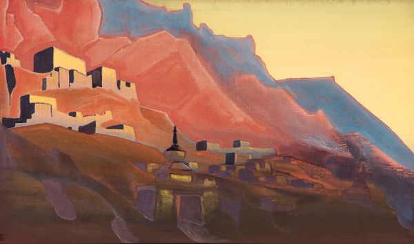 Curator: Nicholas Roerich's "Lhasa," painted in 1942 using tempera and oil paints, presents a captivating vista of the Tibetan city. Editor: The hues! The dramatic contrast between the cool blues and warm oranges gives it a otherworldly feel. Almost like a stage set, doesn't it? Curator: Indeed. Roerich masterfully orchestrates color to convey a sense of spiritual transcendence. Observe how the geometric simplification lends to its symbolic weight. It appears almost timeless. Editor: Speaking of construction, I wonder about the process. Was this painted in situ or reconstructed from sketches back in the studio? The paint application looks relatively flat, not a lot of impasto. It reinforces that stark quality you mentioned. Curator: Roerich, a known theosophist, often embedded esoteric meanings within his landscapes. Note the positioning of Lhasa, elevated, almost floating; it speaks to the sacred nature the artist attributed to the city. The structure looms large within the visual composition. Editor: That makes me wonder about the labor involved in building the city itself, that's often ignored. Also the materials - were they sourced locally? How does the built environment interact with this landscape and what's the impact to the native peoples? This scene, idealized or not, arose from considerable effort. Curator: Such reflections ground our viewing. But returning to Roerich’s formal choices: the deliberate flattening of space rejects conventional perspective, guiding the viewer toward a symbolic reading. Notice also the way the artist outlines the mountains, adding depth. Editor: A valuable point! To me, thinking of materiality and cultural production reminds me to look beyond any formal idealism towards the people who give texture to such environments, and what part they played in making this a reality. Curator: An excellent complement. "Lhasa" resonates on multiple levels—aesthetic, symbolic, and socio-historical. Roerich’s technique provides entry point for further thought and investigation. Editor: Exactly, this landscape and Roerich's approach highlight the dialogue between surface aesthetics and the labor underlying its existence. Food for thought!