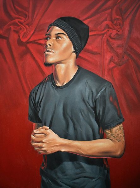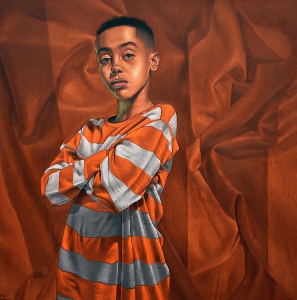 Curator: The artwork before us, simply titled "Rows," was crafted in 2021 by Monica Ikegwu, working in oil paint. Editor: Hmm, there’s something quietly powerful about this piece. The color palette is bold, but the subject’s expression seems contemplative, almost withdrawn. What draws your eye in this work? Curator: For me, it is the symbolism embedded within its contemporary style, specifically how it builds on cultural memory. Notice the precise and intentional rows of braids. In many African cultures, braided hairstyles serve not merely as adornment but as a potent symbol of identity, kinship, and social status, evolving continuously in symbolic meanings. Editor: Absolutely! It's as if the subject's personal narrative is intricately woven, literally and metaphorically, into his hair. There is a deep connection to heritage and individuality. And you’re right; I see how those orange hues in the background act as a fiery sunset or dawn. Curator: Yes, and Ikegwu places a traditional signifier of identity against a Western archetype of individualism. We are confronted by how we process or simplify contemporary experiences that are laden with generations of encoded meaning. Editor: I’m thinking about that jacket too—the sleek modernity, a sign of global youth culture. The orange fading behind this portrait and reappearing in his contemporary coat almost makes this subject backlit as he glances off somewhere we cannot see. Ikegwu emphasizes duality, or perhaps multiplicity. The painting itself is striking a balance between a defined, solid form and the ambiguity of contemporary figurativism. It challenges you, doesn't it? Curator: It does, and that's its power. Ikegwu subtly interweaves cultural threads, offering us not a singular interpretation, but a multitude of avenues for understanding. Editor: Yes, it's not just a portrait; it's a conversation, an invitation to explore identity, heritage, and the beautiful complexities of modern life. I think what will stay with me is how a simple turn of the head evokes volumes!