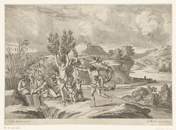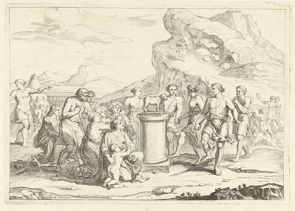 Curator: Ah, yes. Here we have Anton Joseph von Prenner’s engraving from 1728, “Aeneas fleeing Troy.” A story of epic proportions, literally rendered here in fine lines and cross-hatching. Editor: Immediately, I'm struck by this frantic energy, even in the stillness of the print. It's all movement and urgency—everyone’s desperately trying to escape something horrible. The composition emphasizes this with the figures clustered on the left, contrasted by that vast open landscape in the distance. Curator: Indeed, Prenner captures a pivotal scene from Virgil’s Aeneid, Aeneas carrying his father, Anchises, from the burning city, while leading his family to safety. It's steeped in history-painting conventions and, of course, it functions as an allegory of duty, piety, and the burden of legacy. Editor: You can feel the weight, can't you? Not just the literal weight of Anchises on Aeneas's back, but the burden of history, family, and destiny pressing down on him. Look at the musculature in his legs, his straining neck…it's all exquisitely rendered in such detail. I’m moved. Curator: And consider the Baroque aesthetic – that dynamic composition, the dramatic lighting implied through the varying depths of the engraving, even the heightened emotional expressions – it all underscores the magnitude of the event and the inner turmoil of its characters. Note the details: even the tiny ship in the distance awaiting their escape becomes a beacon of hope. Editor: Absolutely. The way he uses line— the density near the collapsing building, lightening towards the implied sea… Prenner brilliantly uses formal elements to narrate this exodus. I admire how this image, composed in blacks and whites, brings this rich and storied narrative to life with palpable feelings and human stakes. Curator: He manages to condense an entire epic poem into a single, evocative scene. It's quite remarkable to consider all those layers—mythological, historical, emotional—woven together. Editor: Looking closer has illuminated all that suffering and resilience so deftly held in place. The lines and the figures—once just elements—now pulsate. Thanks for showing me this gem!