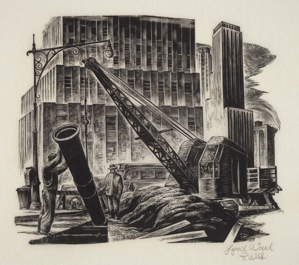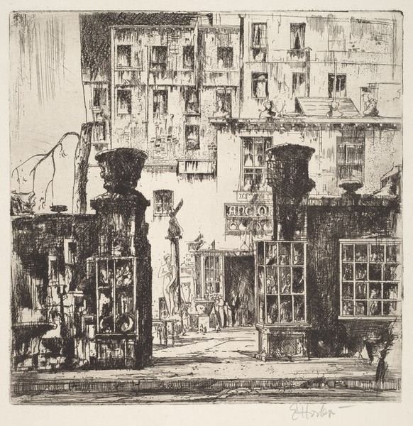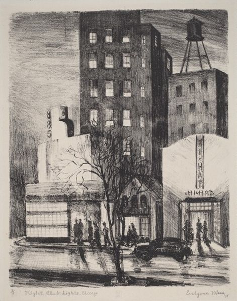 Editor: This is James Boswell's print, "Quiet Evening." There’s no date listed, but it’s held at the Tate. The mood feels…claustrophobic. What do you see in this piece? Curator: This work reflects Boswell's engagement with urban life and its representation in art. Consider the social context of interwar London, where anxieties about modernization and class divisions were prevalent. The "Cafe Rouge" suggests a particular kind of entertainment, doesn't it? Editor: Definitely a bit seedy, a bit glamorous. The title, "Quiet Evening," feels ironic. Curator: Exactly! Boswell is perhaps commenting on the performative nature of urban life, the way public spaces stage social interactions. It encourages us to reflect on the relationship between art and its audience. Editor: I didn't think about it that way! I was too caught up in the visuals. Curator: It's the interplay between the visual and the social that gives it depth. Editor: Thanks, this was very insightful. I'll look at Boswell's work through this lens from now on.