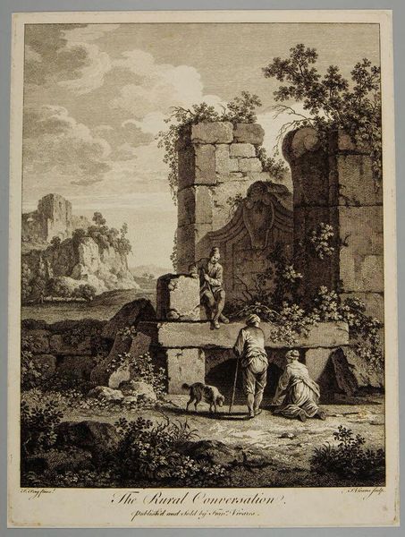 Curator: Albert Christoph Dies created this print, "Sepolcro di Plauzio vicin' a Tivoli," and it resides in the Harvard Art Museums collection. Editor: It's immediately striking—a somber stillness, captured in monochrome. A crumbling tower, rendered with meticulous detail, dominates the scene. Curator: The choice of subject reflects the Neoclassical era's fascination with ruins and the picturesque landscape. It romanticizes the decline of classical antiquity. Editor: I see it as highlighting the lives of everyday people against this backdrop of faded grandeur. A woman rests while a traveler tends to his donkey—their lives unfolding amidst the ruins. Who is this Plautius, and why does his tomb become a landscape feature? Curator: The tomb becomes a symbol of time's passage and humanity's relationship with history. Dies presents a vision of Italy steeped in classical heritage, viewed through a contemporary lens of the late 18th century. Editor: In a way, it’s also about ownership and access. Who gets to claim this history, and how does it shape the identities of those living within its shadow? Curator: True, art always reflects power dynamics. It has given me much to consider. Editor: Indeed. It’s a poignant reminder that history isn't a static monument but a living presence.