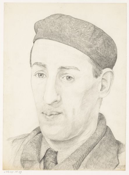 Editor: Here we have Cor van Teeseling’s "Self-Portrait: B-1-1, 5 March," made sometime between 1942 and 1945. It's a pencil drawing with quite a raw and honest feel. The expression seems both weary and a little defiant. What symbols or cultural meanings do you see layered into this portrait? Curator: Indeed, the weariness is palpable, but so is something… else. I immediately note the beret. Berets carry a multitude of symbolic meanings across cultures and time, from artistic expression to military affiliation, even revolutionary undertones. Here, in this context, what might it signify for van Teeseling? Editor: I hadn’t considered the beret specifically. Perhaps it suggests an association with intellectual or artistic circles? Or maybe even resistance, given the historical period? Curator: Precisely! The self-portrait emerges during a time of immense upheaval. This small detail contributes significantly to how we perceive the sitter's self-representation, a possible coded visual language in dangerous times. The gaze, too, is direct, unflinching, as if acknowledging a weight witnessed by both the artist and us. Editor: It’s amazing how a single element can hold so much potential meaning! I’m seeing so much more in this image now. Thanks! Curator: The beauty lies in understanding how even subtle visual choices create layers of interpretation. A single garment becomes a powerful communicator. This enriches our perception and empathy towards a man caught within history’s relentless flow.