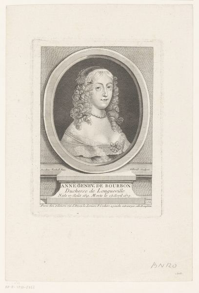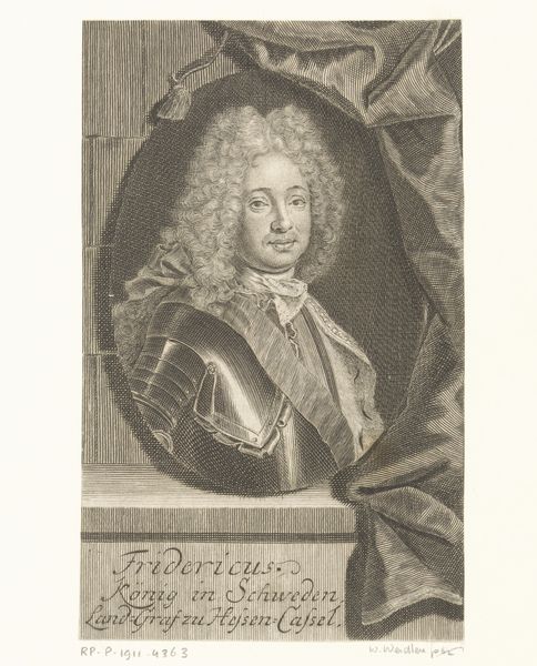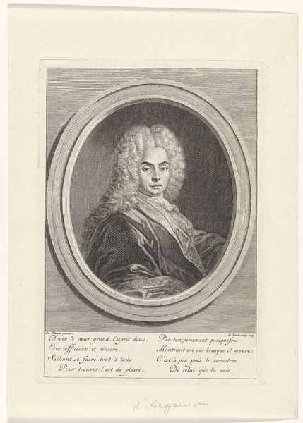 Jacob Houbraken created this print, 'Portret van Cornelis Sweerts', around 1700, using etching to capture the likeness of his subject. At first glance, the oval frame and detailed rendering of the subject's features give us a sense of classic portraiture. However, Houbraken’s formal choices complicate this initial impression. Notice how the composition is structured around contrasting textures: the soft, flowing curls of Sweerts’ wig against the smooth, almost porcelain-like quality of his skin. The oval frame, usually a symbol of containment, here seems to barely hold the effusive energy of the portrait. The lines of the etching, while precise, create a dynamic play of light and shadow that animates the subject. What we see is not just a depiction of an individual, but also an engagement with ideas of representation, challenging the static nature of portraiture through vibrant, almost restless lines. Ultimately, the print destabilizes the traditional portrait format.