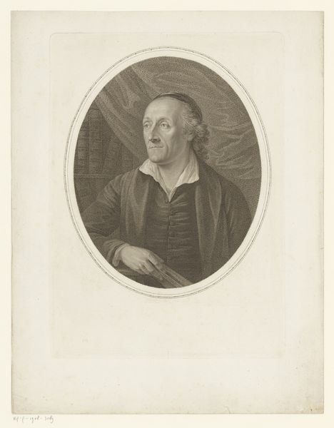 Curator: Looking at this engraving by Carlo Faucci, dating somewhere between 1763 and 1784, what are your initial impressions? It is called "Portret van priester en dichter Benedetto Menzini", portraying the priest and poet Benedetto Menzini. Editor: It strikes me as an image of immense calm, wouldn’t you agree? There’s a gentleness to the shading, despite the formality typical of a portrait. The light catches him so softly; he's positioned amongst books, exuding an intellectual air but with a surprising touch of humanity. Curator: Absolutely, the setting definitely reinforces Menzini’s profession and intellectual character. But I see it as a carefully constructed piece reflecting the politics of imagery. Notice how he's not just a priest, but specifically labeled, his noble ties carefully documented in the inscription below? Editor: Yes, "Sacerdote, Poeta Toscano PAMA"—it certainly underlines his credentials. He's presented here as an accomplished man, both spiritual and literary. What can you tell me about those visual elements in the portrait that go beyond status? Curator: Those are rich in symbolism. Consider the open book. It may signal knowledge freely shared, or an idea still in progress. It depends on who commissioned the portrait and the kind of statement they were looking to make at the time about art, the church, or the role of men of letters in society. Editor: I agree there is no easy interpretation. But, the aged paper also evokes a sense of history and endurance, it also suggests the weight of tradition upon him. In psychological terms, you can say this connects to themes of cultural continuity and perhaps even personal legacy. The way the light falls almost seems to sanctify his scholarly pursuit. Curator: True, the psychological element is powerful. By focusing on those nuances of expression, and cultural symbols of class, we also unveil the complexities within these established power structures and that says as much about Menzini as it does about the politics of his time. Editor: I appreciate the depth that's been unveiled through this image, its layers and multiple significances resonate with our understanding of that historical period and the men and institutions that sustained its socio-political order.