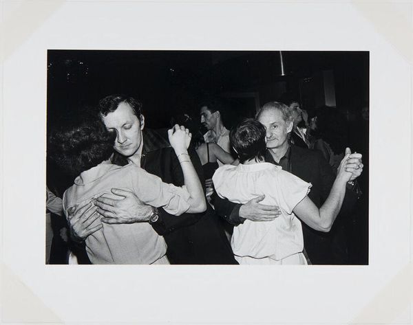 Editor: This is Larry Fink's "Studio 54, New York City" from 1977, a gelatin silver print. The monochrome palette creates a really stark contrast, and everyone looks so…detached. What do you see in this photograph, considering its visual elements? Curator: Primarily, the composition strikes me. Fink employs a seemingly casual arrangement, yet the diagonal lines formed by the bodies create a dynamic tension. Observe how the contrast emphasizes textures – the smooth skin versus the rough fabric of clothing. Editor: So, it's less about the actual event and more about how it's framed and presented? Curator: Precisely. The interplay of light and shadow sculpts the figures, imbuing them with a sculptural quality. Also note how the limited depth of field flattens the scene, pushing the figures to the forefront. It directs our eye in specific ways. How does that inform your reading? Editor: It makes it feel claustrophobic, almost like we're intruding on a private moment, or a series of them. I didn’t notice the textures so much before, either! Curator: The graininess of the print enhances that feeling, suggesting immediacy, and perhaps even a degree of voyeurism. The frame itself becomes a crucial element in shaping our experience. Editor: That makes sense. I initially saw it as a snapshot, but now I'm thinking about the conscious decisions that make it art. Thanks! Curator: Indeed. Close examination reveals intentional choices within apparent spontaneity. Hopefully you can use this technique with your studies going forward.