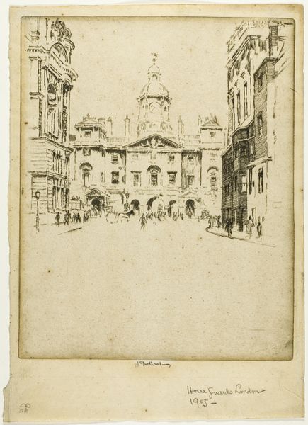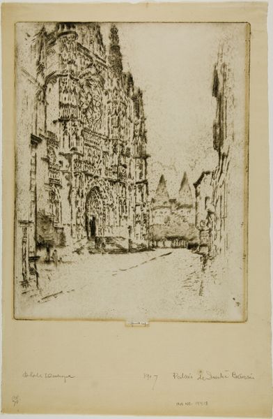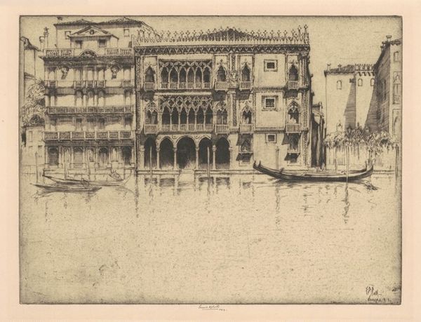 Joseph Pennell created this etching, "The Gate of the Temple", around 1906. The etching process begins with a metal plate, usually copper or zinc. The artist covers the plate with a waxy, acid-resistant ground, then draws an image into the ground with a sharp needle, exposing the metal. The plate is then immersed in acid, which bites into the exposed lines, creating recessed marks. After the ground is removed, ink is applied to the plate, filling the etched lines, and the surface is wiped clean. Finally, damp paper is pressed against the plate, transferring the ink to create the print. Pennell was celebrated for his skill in this labor-intensive process. As an artistic medium, etching allows for the kind of intricate, detailed rendering that you see here. More than that, the graphic quality of the medium seems well-suited to capturing the industrial age. Though the scene is of a grand structure, it is depicted in a manner that suggests its imminent obsolescence. Understanding the material and the making allows us to see how the artist's choices can resonate far beyond the image itself.