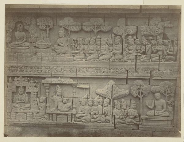 Editor: We’re looking at a gelatin silver print of a bas-relief on the north wall of Borobudur, taken by Isidore Kinsbergen sometime between 1873 and 1879. It depicts scenes of ancient life, almost like frozen stories. What catches your eye when you look at it? Curator: Ah, Borobudur! It whispers tales, doesn't it? For me, it's the incredible density. Imagine the artisans, chiseling away, revealing stories within stories! I see patience, devotion, an entire cosmology carved in stone. Do you get a sense of the narratives being non-linear, cyclical even? Editor: Absolutely. The way the figures are arranged makes it seem like multiple moments in time are happening all at once. What do you think people were meant to take away from these stories? Curator: Enlightenment, I suppose, visualized. Each level of Borobudur corresponds to a stage of spiritual ascent. The bas-reliefs weren’t just decoration; they were teaching tools. Each image a stepping-stone, leading you, level by level, towards Nirvana. Makes you think about how we learn now, doesn't it? Through fleeting images, not slow-carved eternities. Editor: It definitely puts our modern methods in perspective. It's almost overwhelming to consider the time and effort that went into creating this. Curator: Exactly! It makes me feel deeply connected to those unknown artisans, their devotion radiating from the stone. It’s a powerful reminder that true beauty lies not just in the image, but in the process, in the very breath of its creation. And also…it makes me want to grab a chisel and try it for myself! Maybe just on a piece of clay… Editor: I agree. I'll definitely remember the patience and devotion behind it the next time I see it. Thanks for sharing your perspective.