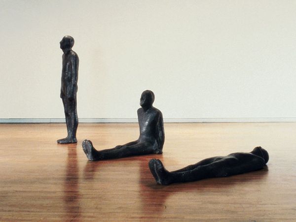 Curator: Immediately, I’m struck by the abject forms and muted color of these lead figures. They feel heavy, both literally and figuratively. Editor: Indeed. The artist, Antony Gormley, calls this work "Three Ways: Mould, Hole and Passage." The materiality of lead is significant here, its weightiness and association with industrial processes emphasize the labor involved in their creation. Curator: And they evoke a sense of vulnerability, don't they? Especially considering Gormley's broader explorations of the body in relation to space and being. They speak to the experiences of alienation and objectification that many marginalized bodies have historically experienced. Editor: It's fascinating how the artist uses the industrial material to create forms that echo universal human experiences of being, while also questioning the mass production that shapes our identities. Curator: It’s a potent commentary on the human condition, rendered through a critical lens on material and making. Editor: Yes, a compelling intersection of form, material, and the politics of embodiment.