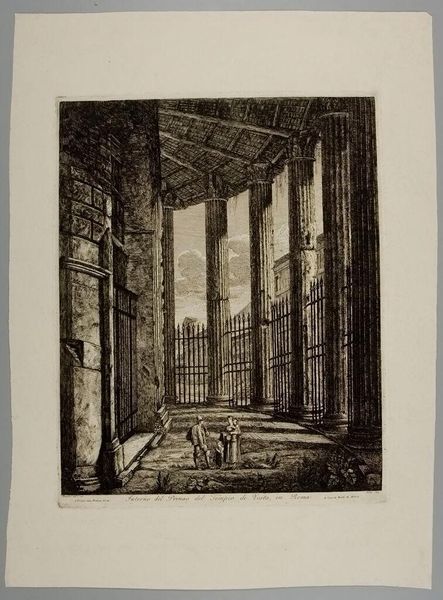 Editor: This etching by Scipione Daretti, titled "Interior of a Castle with Composite Corinthian/Egyptian Columns," presents a grand architectural space. I’m struck by the almost Piranesian sense of scale. What do you see in this piece? Curator: This work speaks volumes about power, doesn't it? The immensity of the architecture, the composite columns blending different cultural styles... It suggests a forceful assertion of dominance, a visual manifestation of control. How do you see the use of space contributing to this? Editor: I guess the vastness could make a person feel small, insignificant, in comparison. Curator: Exactly! And consider the historical context. Architectural prints like this served not just as records, but as tools of ideological propagation. They dictated how people perceived authority. What can we learn by examining these power structures? Editor: I hadn't thought about it as a political statement before. Curator: Art always reflects society. We just need to ask the right questions.