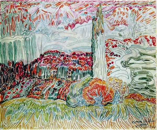 Curator: Immediately, I’m struck by its overwhelming sense of depth despite the apparent flatness of the application. What a stunning and peculiar composition. Editor: Let me introduce you to this piece. This is "Ancient Flame" by Sattar Bahlulzade, painted in 1968. It's an acrylic on canvas and it’s an incredible example of Azerbaijani Expressionism. Curator: Ah, Expressionism! That makes perfect sense. The dynamic brushstrokes create such rhythmic lines that unify the surface, even with that odd tower-like form disrupting the upper register. The interplay of analogous colors gives it vibrancy. Editor: Bahlulzade, despite the heavy Soviet censorship at the time, maintained his individuality. His art became an important contribution to Azerbaijani identity in that period of cultural repression. It reflects a yearning for spiritual expression, something subtly rebellious given the socio-political constraints. Curator: The canvas practically vibrates. I see the formal structure here playing with our expectations. While "Ancient Flame" appears initially chaotic, there's a clear structuring principle guiding the frenetic marks – layers, from earth to settlement to sky. It gives the eye a visual anchor and a path to follow. Editor: Absolutely. And think of Bahlulzade’s role—he took traditional landscape painting and, through abstraction and expressive color, reinvented it for his contemporaries, offering a coded critique of Soviet cultural uniformity. The fire, even an "ancient" one, symbolizes resilience. Curator: Interesting that you read it politically. For me, the painting’s strength lies in its pure manipulation of visual components— color, line, and form create something arresting and undeniably evocative. The cultural meaning certainly gives it another layer of context though. Editor: Ultimately, Bahlulzade’s work stands as an act of cultural preservation. Curator: And it serves as a timeless example of color theory.