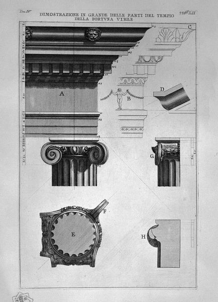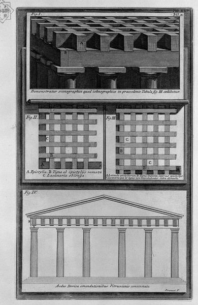 Curator: Looking at this piece, I’m immediately struck by the rigid, almost scientific, way it documents the ornamentation. There’s a formality that reminds us this isn't just art, but a record, a study. Editor: A study in pattern, wouldn’t you say? The composition strikes me as both elegant and eerie—the black and white etching gives it a ghostlike quality. Like we're glimpsing a past both vivid and irrevocably gone. Curator: Exactly. It's an engraving titled "Several adorned the walls, vaults and floors in mosaic, existing in the cam of the Opera House for the decorations of Pompeii" by Giovanni Battista Piranesi. It’s fascinating how he depicts the interior decoration from Pompeii—captured in precise detail, but also distanced. The viewer becomes a researcher examining the past. Editor: The repetition of motifs—garlands, masks, figures with spears—suggests not just decoration but also a deeper, symbolic language at play. It makes me wonder what those ancient emblems communicated to the people who lived amongst them. What memories did these images spark? What power did they hold? Curator: The "Grand Tour" was popular, especially for wealthy Europeans and Americans. So documenting and distributing engravings like this helped circulate these visual motifs, contributing to Neoclassical taste. Pompeii wasn’t just a city; it became a repository of ideas, aesthetics, and historical narratives that influenced art, architecture, and design for centuries. Editor: Notice the theatricality in the layout. It’s almost staged, prompting us to decode these carefully arranged emblems and consider what values they might express about the civilization that made them. And despite being ruins now, they still communicate volumes about artistry, architecture, and taste in ancient Roman times. Curator: It speaks to the persistent human need to understand and capture history and cultural practices. The formal rigidity contributes to this study. Editor: Agreed. There's so much history contained within this drawing, it invites us to reflect on the symbolic legacy that Pompeii carries forward.