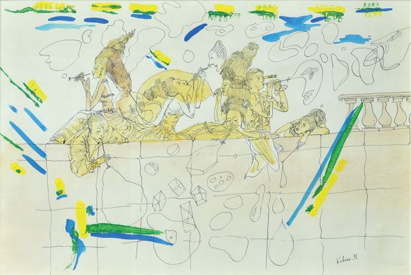 Editor: So, this is Salvador Dalí’s “Prophetie daliniene,” created in 1942 using tempera and watercolor. My first impression is...intense. It feels chaotic, almost like a dream—or a nightmare—unfolding on paper. All these strange, menacing figures... Where do we even begin to interpret this? Curator: Indeed! It’s a piece that vibrates with anxiety. What strikes me is the premonitory shiver it sends down my spine. Dalí painted this smack-dab in the middle of World War II. It's almost as if the work *knew* something terrible was in the offing, the way animals sometimes sense earthquakes before they happen. See those figures falling from the sky? They could be soldiers, or perhaps the innocence of mankind plummeting into the abyss. What do *you* see there? Editor: I see a real sense of helplessness. They’re just sort of… drifting. And the dragon-like creatures looming above? Curator: Precisely! Think of them as personifications of impending doom. Dalí was always playing with symbols, blurring the lines between the real and the surreal, but I feel that he somehow created his own version of a surrealist Nostradamus' predictions here. It's less about prophesizing a literal event and more about capturing the atmosphere of fear. Don't you agree? Editor: Absolutely. It's that feeling that makes it so powerful. So much artistic exploration hinged on simply trying to make sense of it all. The dream-like qualities are so arresting, capturing all this destruction with tempera and watercolor. Incredible! Curator: I'm struck with this sudden realization that it could be argued that it *is* incredible because of the fact he rendered something that weighs so heavily on the spirit with the light of something like watercolour and tempera! Thanks for guiding us to that.