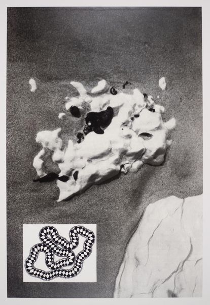 Curator: Al Taylor created this mixed-media piece, "B. (All Thumbs)" in 1997. It incorporates photography, printmaking, and sculpture elements. My immediate impression is how playfully disorienting it is. The composition teeters between recognizable and completely abstract. Editor: Disorienting is right! There's a visual tension between the sharp geometric lines, those looping gestures in the center, and what looks like a photographic element...the blurred mass beneath it all could almost be organic, maybe even representational? It challenges your expectations. Curator: Exactly! Taylor’s work often returns to these sorts of tensions. The interplay between geometric form and suggested organic shapes calls to mind cave paintings or even primitive renderings of hands, maybe suggesting an essential and basic human attempt to record ourselves, which has extended and is continuing to stretch over tens of thousands of years. Editor: And perhaps that impulse to document is frustrated here; the "all thumbs" in the title brings an air of ironic clumsiness. There's something profoundly human about failure to capture, and it’s also tied, in my mind, to issues around authorship, disability, or social roles associated with that sort of work. Curator: Yes, it raises intriguing questions about skill, intention, and even the symbolic significance of the hand itself—a recurring motif in art history that can simultaneously signify power, creation, and labor. Maybe even a deconstruction of how traditional, often white and male dominated art is “supposed to look” like a photograph with traditional drawing superimposed upon the likeness. Editor: Thinking about the context of the late 90s, during which the digital world started taking over more and more spaces, this mixed media piece may suggest a move away from relying entirely on technologically aided means for artmaking or, perhaps, it can also be understood as an early contemplation of our current technological overload that has removed many people away from a dependence on physical actions or dexterity. Curator: So much food for thought, seeing a work which is, on the one hand, very simple and very reduced, and seeing that simple thing lead to some quite sophisticated questions. Editor: Agreed. And now I am left to rethink our roles with artmaking and to consider how this artwork is not simply about making art but engaging in visual meaning and knowledge production overall.