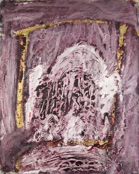 Curator: Before us, we have "Cosmogonie" by Horia Damian, a mixed-media artwork from 1962 that explores themes within abstract expressionism and what some term matter-painting. Editor: Wow. My first thought? A supernova going down in flames! There's this furious energy but also this undeniable sense of…exhaustion? Like the universe is letting out one gigantic sigh. Curator: Damian was part of a generation of artists exploring the boundaries of non-objective art after World War II. He aimed to go beyond the purely aesthetic, attempting to depict something intangible and monumental. The context is crucial; many artists felt a need to reckon with large scale violence and destruction, seeking to visualize it within the language of abstraction. Editor: Intangible and monumental is spot-on! It almost looks like a topographical map of…nothing I've ever seen. The textures he builds with oil paint—I see it as like mapping the unmappable—you feel the weight of existence pressing down on you. And that gold arch… Curator: The gold certainly invokes Byzantine iconography—that tradition uses the metal to depict a heavenly or spiritual realm. Consider this as Damian engaging with traditions that elevate and revere painting’s potential for spiritual or existential experience. Editor: It definitely has that shimmer of the divine, like some lost icon retrieved from the deep sea! But honestly, I also read the title a little sarcastically? Is it mocking our human impulse to slap neat names onto cosmic chaos? Maybe! The way he uses this mixed-media really sells the idea of the universe under duress! It’s beautiful, terrifying…mostly beautiful. Curator: His works were exhibited frequently in galleries across Europe and were celebrated at a moment when abstraction had become dominant in artistic circles, with institutions and collectors showing a high appetite for it. This period represents a fascinating convergence of artistic intent, market conditions, and social reckoning, something clearly demonstrated by Damian's work. Editor: Seeing all that turbulent motion crystallized here in globs of oil is just mind-blowing. I would love to sit and stare at this all day. It’s truly stunning to see the physical embodiment of an existential crisis. Curator: Absolutely! This exploration shows Damian's interest in abstract-expressionism. Editor: This was incredible!