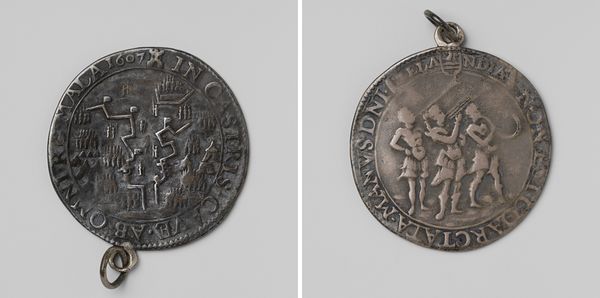 Editor: So, this piece is a metal medal commemorating "The Death of Maarten Harpertsz. Tromp, Killed Near Katwijk," created in 1653 by Jan Lievens. It's Baroque style, which you don't usually see in this form, so it makes me wonder what other historical and artistic narratives can exist in small pieces? What stories do you find etched in the medal? Curator: Well, it’s like holding a little piece of bravado, isn’t it? Tromp was a rockstar admiral back then, a true Dutch hero. Lievens, more known for painting, really captures the intensity of the era in metal! Note the ship scene on the reverse. What does it suggest to you about sacrifice and patriotism? Editor: The naval battle scene gives me chills! To me, it evokes immense power, though on the reverse is such intense emotion. Was it commissioned or some other kind of creation? Curator: Good question. This medal wasn’t simply whipped up. These were, like, official souvenirs— almost proto-selfies for a budding nation proud of its naval victories! People kept these and showed them around. But it's more than a memento. Lievens sneaks in, let's say, a philosophical musing on national glory and mortality, using sharp edges and gleaming metal to bring it to life. Don’t you feel a tension there? Editor: Totally! I'm realizing the metal isn’t just a medium, but adds another layer to the story itself: lasting, durable and something to admire! I didn't notice at first. I really love his work. Curator: Precisely! Think of the tactile experience, the cool weight of the medal, the play of light on its surface—it invites interaction, commemoration. Art then becomes like a memory, right? Editor: Yes, art becomes memory in metal. That’s an interesting point to consider!