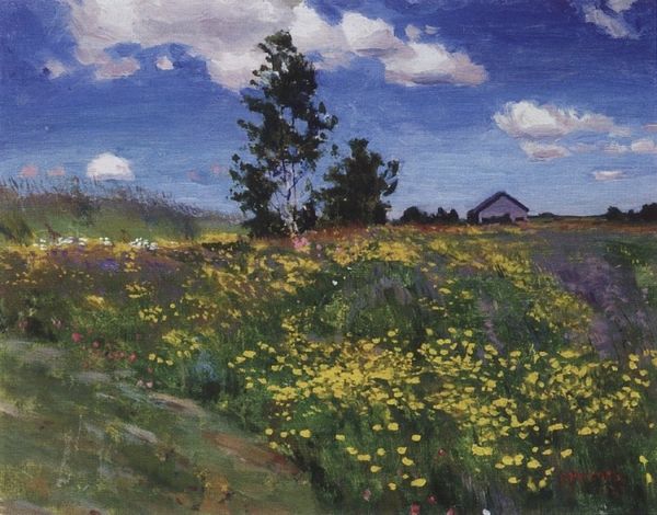 Granville Redmond painted "Patch of Poppies" with oil on canvas, using techniques of the late 19th and early 20th century. Oil paint is made of pigments mixed with drying oil – linseed was common. Redmond likely built up layers of paint, perhaps starting with thin washes and then adding thicker applications to give depth and texture to the flowers and fields. Look closely and you can see how the brushstrokes themselves contribute to the liveliness of the scene. The canvas support also plays a role. It provides a receptive surface, but also a standardized one. As industrial production made canvases more affordable, it helped democratize painting and make it accessible to a broader range of artists. Considering the painting’s materials and processes helps us appreciate the artist's skill. It also reminds us that even seemingly straightforward landscape paintings are tied to wider systems of labor, production, and consumption. This brings into focus the cultural and social significance of the artwork.