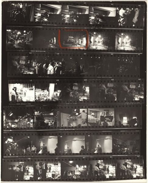 Robert Frank created "Guggenheim 653--Cafeteria, San Francisco" using film. The composition is divided into rows of frames, resembling a film strip. Each frame captures different moments within the cafeteria space. The use of black and white enhances the starkness and contrast. The high contrast, combined with the grainy texture, creates a raw and immediate experience. The repetition of figures, lined up in a cafeteria setting, presents a visual rhythm. The film strip format adds a sense of sequence and narrative, yet the disconnected nature of each frame disrupts a conventional storyline. This work, like much of Frank's oeuvre, challenges traditional photography by emphasizing subjective vision and the deconstruction of linear narratives. Consider how the materiality of the film strip itself—its physical divisions and inherent limitations—mirrors the fragmented experience of modern life. The frame becomes a metaphor for both confinement and observation. This photograph operates as a cultural critique, inviting us to question the structures that define our perception and understanding.