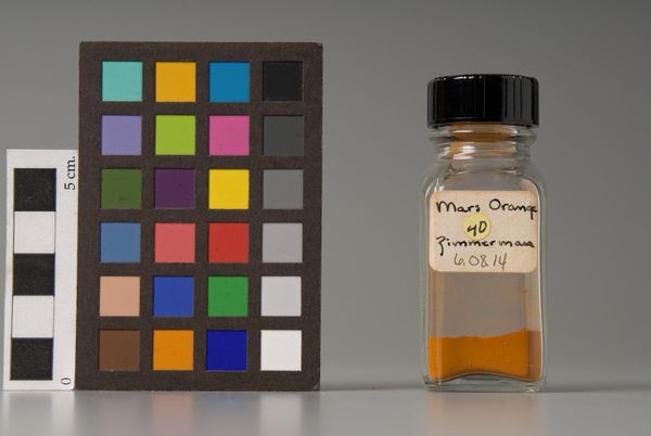 Editor: Here we have Cadmium Yellow, produced by Charles Roberson and Co. The yellow pigment at the bottom of the jar is so vibrant! What strikes you most about this seemingly simple composition? Curator: The arrangement is quite deliberate, isn't it? Consider the color chart's grid structure juxtaposed with the cylindrical glass form. The visual interplay between controlled standardization and the raw, vibrant pigment within the bottle creates a dialogue about art's creation. Editor: So, it’s about the contrast? Curator: Precisely. The composition draws attention to the inherent properties of the pigment itself. It asks us to consider the formal elements before representational concerns. It’s the essence of color, presented for our analysis. Editor: I never thought about pigment this way. It's like a deconstruction of color itself. Curator: Indeed, it prompts a reconsideration of how we perceive and understand the very building blocks of art.