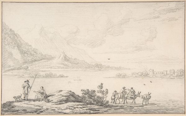 Curator: Looking at this work by Vilhelm Kyhn, crafted in 1854, we see "Mountain Region in Tyrol," rendered as a print using etching. The landscape certainly evokes a sense of place. Editor: Absolutely, there's a quiet solitude to it. A touch bleak, even, despite the grazing livestock. Like a stage set just before the players arrive, but beautiful. All done in blacks, greys, and whites. You feel a sense of cool air rolling down the slopes. Curator: Kyhn was quite involved in shaping Danish art through his teaching, championing a more nationalistic approach to landscape painting. The etching technique allows for a great degree of detail. Notice how the mountains in the distance seem to fade into the background, a skillful use of atmospheric perspective. Tyrol, though, is interesting, as this is Austria! Was he commenting on cultural or political exchange, perhaps? Editor: It almost feels contradictory, doesn’t it? The crisp detail against such a vast scene… like he's pinned down a fleeting memory. To me, the muted palette underscores a certain melancholy, maybe even homesickness. As if Tyrol wasn't quite "home," but memorable nonetheless. The pigs certainly don't seem bothered. Curator: Yes, I agree about this "snapshot" effect. And to be fair, these works also appeared as illustrations within travelogues. So, what was Kyhn doing, traveling in the Tyrol, and bringing those sights back to Denmark, for broader distribution. Interesting that he should choose these, essentially farm animals, for our gaze. Were pigs fashionable? Not so much now. Editor: Maybe it's that very grounding that gives it such impact! Not grand vistas or sublime panoramas. Everyday life unfolding, wherever he happens to be. It's lovely how the clouds almost mirror the peaks behind them too. What’s art but looking at the world? And this seems so down-to-earth. A welcome bit of reality. Curator: Indeed, a very compelling piece. Thinking of the era in which it was produced, this reminds us that artistic interpretation is always linked to social and historical forces, a moment in time caught and reflected back to us, across centuries. Editor: And for me, it’s about the magic that artists possess. A moment seized and transformed, shared with us here, today. And sometimes, just sometimes, that is pure, distilled feeling made visible.