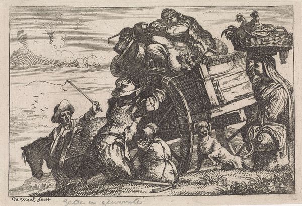 Curator: Allow me to introduce “Haven met kooplieden en pakezel,” or “Harbor with Merchants and Pack Animal,” an etching dating from 1679 to 1728 by Johannes Gronsveld. Editor: The immediate impression I get is of bustling commerce, captured with these incredibly fine lines and hatched shadows. It’s as though we’re witnessing a staged performance of labor. Curator: Indeed. The material reality is that this print, created through etching, was likely circulated widely. It speaks volumes about the Netherlands’ fascination with global trade at that time and the orientalist interpretations. Editor: Right. We're seeing this through the lens of the Dutch Republic and their colonial ambitions. How was Gronsveld involved in disseminating similar images? How did they inform perceptions of the 'exotic' other? Curator: It is not well recorded exactly how it was traded; what is available however is insight into the materials used to construct the piece itself. Etching involves coating a metal plate with wax, drawing a design through it, and then using acid to bite into the exposed metal. After which, many images can be made, an almost industrial manufacturing style for images in the era. Editor: The ships in the background, those sturdy barrels with the bold ‘MM’ inscription... even the weary expression of the pack animal laden with goods, it's all such detailed production. Did this reflect on society? Were such trade goods seen in homes often? How might the working class interpret the symbols presented by the artwork? Curator: Considering how it could be reproduced relatively easily via etching, it suggests the image itself was a commodity circulating in the social world, impacting values, beliefs and possibly trade practice itself. Editor: Fascinating! Seeing the port city so active really shows just how material realities shape the art of that period. Thanks, Curator. Curator: My pleasure. It's clear that the print really shows how materials and historical perspectives enhance our comprehension of society then and there.