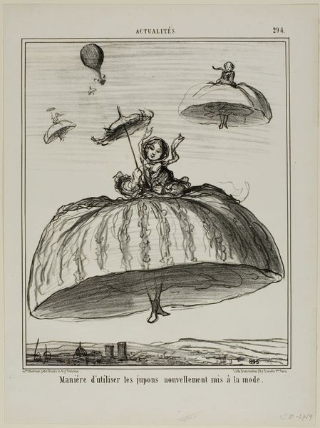 Editor: This is "Une Descente en Parachute," a print by Honoré Daumier from around the 19th century. There's a dark, almost sardonic humor to it, with this caricature of a man descending, or maybe being dragged down, by a parachute over a detailed city view. How do you interpret this work? Curator: Considering Daumier's context, we should note that his prints appeared in newspapers of the day. Daumier routinely addressed social and political issues. It's key to consider this not just as an image, but as a public statement delivered in a specific moment. The title says that 'the Devil carries away Monsieur Godard'. Do you notice where he might be heading in the picture? Editor: He’s right above a lightning rod in the image. Why does the description say that "the devil takes him away for wanting to cut the cord"? Curator: Ah, exactly! Now, think about what cutting the cord might symbolize in 19th-century France. This was a period of rapid change, social upheaval, and political instability. Perhaps cutting the cord refers to challenging the established order, a radical act the artist links to hubris and danger, literally carried off to hell. The parachute itself becomes an ironic symbol of reliance on faulty, even devilish, means. And the city beneath, with its prominent buildings and sharp social divides, is this the Paris Daumier relentlessly critiques? Editor: That makes a lot of sense. It connects the humor with something more serious. It's like he’s saying progress without careful consideration, without societal stability, leads to downfall. I learned that connecting the artwork to its place, in this instance literally in Paris, but also conceptually and in time, really matters! Curator: Precisely. Understanding the cultural and historical underpinnings transforms a simple caricature into a powerful socio-political commentary. It also reveals Daumier's critical position on his contemporary society.