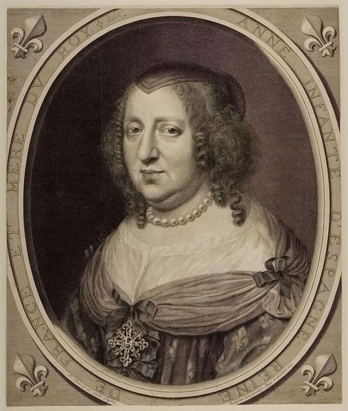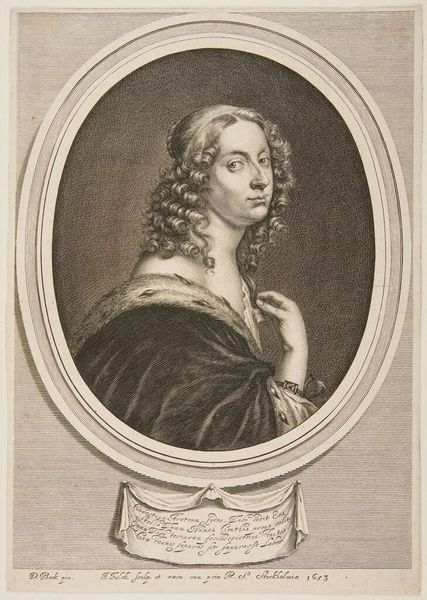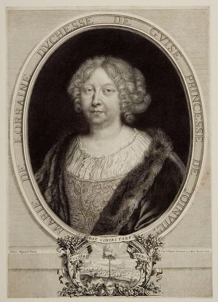 Curator: This is Robert Nanteuil’s portrait of Anne of Austria. Nanteuil, born in 1623, was a master of engraving, and this piece resides in the Harvard Art Museums collection. Editor: It's a striking portrait; the oval frame, the fleur-de-lis—it all speaks of royalty. I'm immediately drawn to the almost unsettlingly direct gaze and the ornate cross pinned to her garment. Curator: The cross is the insignia of the Order of the Holy Spirit, a chivalric order associated with the French monarchy. Anne's role as Queen Consort and later Regent shaped France during a tumultuous period. Editor: Indeed. The subtle gradations Nanteuil achieves—the shadows defining her face, the delicate rendering of the pearls—those speak to a calculated projection of power, carefully constructed visual rhetoric. Curator: The inscription framing the portrait, "Anne, Infanta of Spain, Queen and Mother of the King," highlights her complex political identity and her crucial role in securing the Bourbon dynasty. Editor: It's a powerful reminder that portraits, beyond mere likeness, functioned as symbols of authority and enduring influence. A fitting image to unpack today.