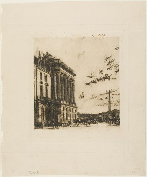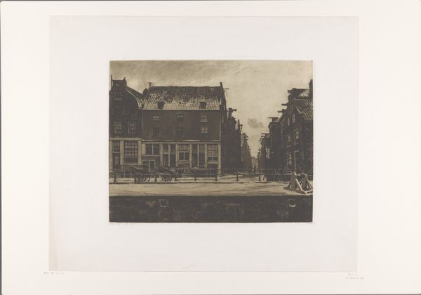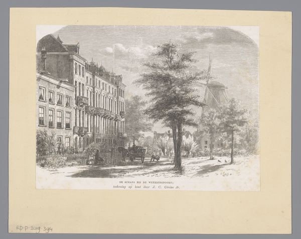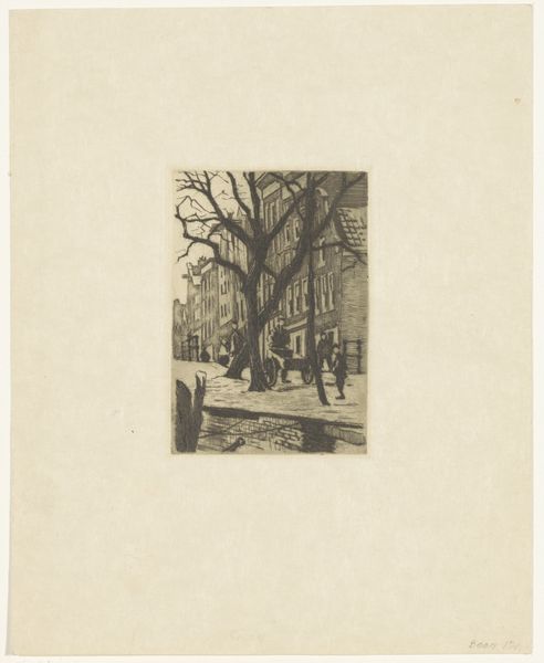 Curator: Before us we have "Herengracht 493 en 495," a pencil drawing by Cornelis Gerardus 't Hooft, likely created sometime between 1801 and 1871. Editor: It's unassuming, isn't it? A quick sketch capturing a quiet moment on the canal. Feels intimate, like flipping through a private sketchbook. The bare trees almost veil the buildings...it’s wistful, melancholy even. Curator: I'm intrigued by the deliberate choice of medium. Pencil allows for a nuanced tonal range and delicate lines that convey the textures of the brick and the aging process inherent in architecture. 't Hooft captures not just the structures, but their relationship with time. We see evidence of use and age. Editor: It does feel very "lived-in." I like that, despite its precision, it has a looseness to it, like a memory sketched down quickly before it faded. What do you make of the compositional choice? It feels so central. Curator: Central composition flattens the perspective, pushing the buildings forward almost like a stage set. This likely reflects the conventions of architectural drawings of the time, which prioritized clear representation. Note also the marks in the foreground, possibly notes made during the sketching process - an important addition from a materialist point of view. Editor: Absolutely. I also appreciate how the artist uses the negative space—the paper itself—to define the sky and water. The sketchy quality almost makes it breathe. You can practically feel that chilly, damp Amsterdam air! Do we know anything about 't Hooft’s connection to this place? Curator: Sadly, details about his personal life are scant, but given his artistic output, he likely spent a considerable amount of time observing and documenting the built environment around him, maybe cataloging for business reasons. Editor: A document of place, time, and technique! It makes me consider what my neighborhood will look like two hundred years from now, sketched by a future observer, bearing the marks of time and change, or still being a solid place to trade with others... Curator: Precisely! This work makes me consider what will still be in operation as a commodity from our time in centuries to come. A poignant consideration given the passage of time marked here.