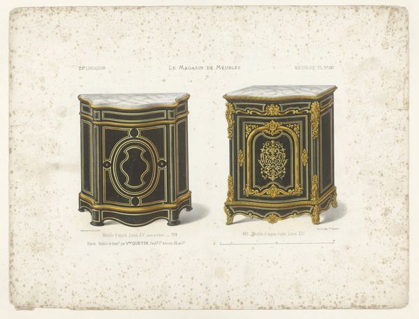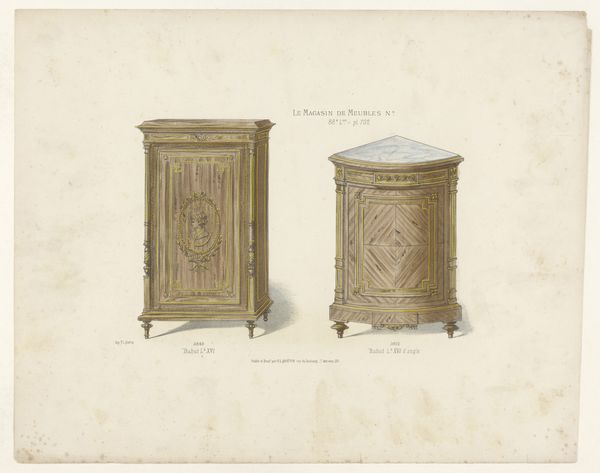 Curator: Let's discuss this lithograph titled "Kast en ladekast," which roughly translates to "Cupboard and Chest of Drawers," dating from after 1878. I’m intrigued by the medium itself. What jumps out at you? Editor: I notice the incredible detail, especially in the gold embellishments on the furniture. It's surprising to see such intricate work reproduced as a print. What insights can you offer on the use of lithography for such a detailed design, and the decision to colorize it? Curator: Exactly! Consider the process: lithography relies on the chemical repulsion of oil and water, allowing for replication of fine lines and textures. The choice of this method speaks to the growing demand for accessible design during the period. The subtle coloration suggests an effort to mimic the appearance of handcrafted, more luxurious objects. Editor: So it's less about the artistic expression of the designer and more about the means of production and its societal function? Curator: Precisely. What materials would have been within reach of the upwardly mobile middle classes? This print facilitates the *illusion* of luxury, hinting at a market saturated with aspirations of refinement. Editor: So the paper itself becomes a crucial element? Like a canvas for democratic design, showcasing furniture styles to a wider audience. Curator: You're grasping the crux of it! Paper becomes a site where the values associated with luxury items get disseminated into the culture. Were those values truly shared with those who labored on producing such artwork? How does it shape perceptions of design? Editor: Thinking about it as a historical document showing consumerism democratizing design...that definitely changes how I see it! Curator: It becomes a reflection on the values embedded in the materials and their method of distribution.