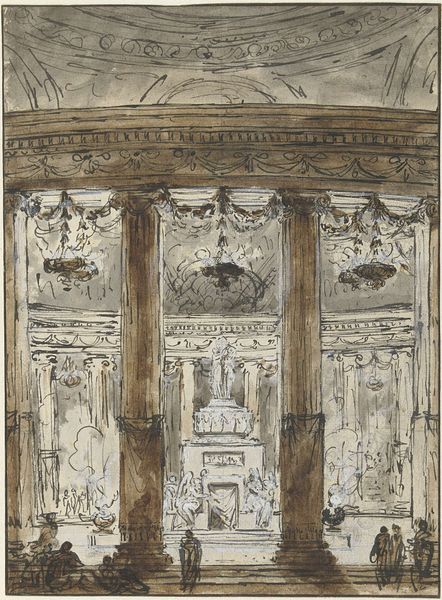 Curator: Elisabeth Fulda created this work around 1938. It's titled "Portion of a Drawing Room" and is executed in watercolor and drawing media. It has a striking, almost stage-set quality to it, wouldn’t you say? Editor: Indeed, a proscenium of domesticity. My first impression is of constraint. The palette is muted, almost faded, and the composition feels overly symmetrical, as though everything is positioned for a formal portrait, hinting at hidden dynamics, or tensions held in place by etiquette and expectation. Curator: Fulda uses repetition effectively here. Observe the recurring floral motif in the wallpaper, mirrored, though subtly distorted, in the floral arrangements beneath glass domes on the mantelpiece. The wallpaper is Academic-Art, it must be said, but it works. How might we decode these echoing forms? Editor: The flowers, I think, carry a double valence. They are conventionally associated with beauty and domesticity, of course. However, contained within those glass domes, they take on a slightly morbid quality. Preserved, yet also somehow entombed, suggesting the fleeting nature of beauty and perhaps, the constraints placed upon women within the domestic sphere. Curator: An astute observation. Notice, too, how Fulda renders the reflection in the mirror above the fireplace. Instead of a clear depiction of the room, we see only the vague impression of a chandelier. The artwork's symmetry and restricted palette may deliberately draw viewers to certain visual elements, framing how the architectural is lived in. Editor: Precisely. And that chandelier becomes significant through its ethereal quality. Lighting, in symbolic terms, suggests enlightenment, but its clouded representation here perhaps indicates a kind of obscured or indirect knowledge, seen only through the lens of convention or social expectations, just barely suggested through visible form. The chairs on each side act almost like theater seating, suggesting spectators or those under watch within the composition of everyday life. Curator: A fascinating interpretation. Looking closely, Fulda's artistry lies in precisely this tension: between surface-level elegance and subtly unsettling symbolic depths. Editor: Exactly. The power of a work like this, for me, lies in how a seemingly straightforward depiction of domestic space becomes a portal into exploring wider themes of confinement, illusion, and the precarious beauty of appearances.