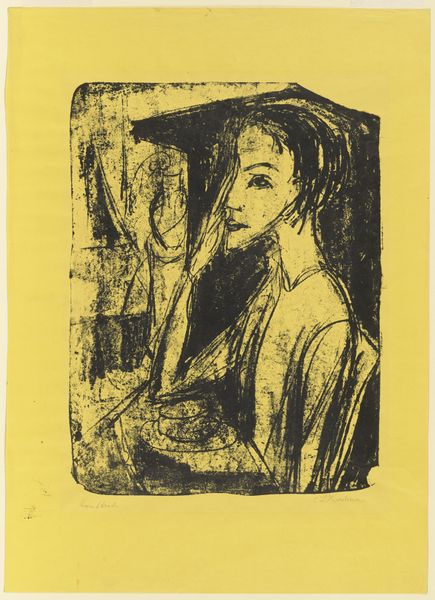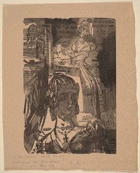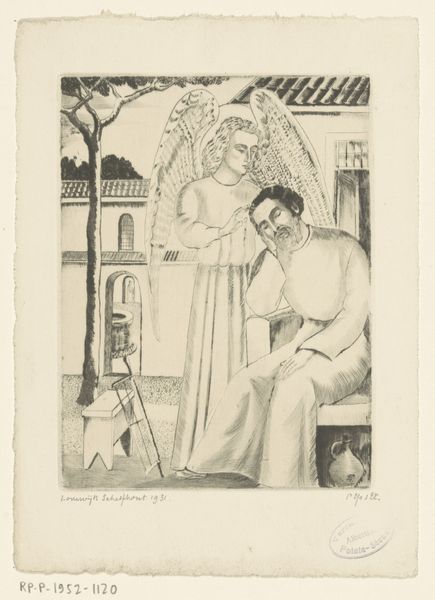 Curator: Ah, yes. Here we have Lodewijk Schelfhout’s "Pierrot II", created in 1918. It’s an etching, currently held in the Rijksmuseum. It's interesting to see how Schelfhout explored symbolism within an expressionistic style. Editor: Immediately, the Pierrot's eyes draw me in; they're closed in an almost melancholic reflection. The print itself has this incredibly intimate feel, like stumbling upon a private moment of the soul laid bare. Curator: Pierrot is a very old archetype, emerging from the commedia dell’arte tradition. His white costume, the ruff, these elements carry a heavy history of the outsider, the melancholic clown always yearning for the moon, often a symbol for inaccessible desires and unattainable ideals. Editor: Exactly! And Schelfhout's composition deepens this. The darkness pressing in from the sides, that distant cityscape, even what seems to be a ghostly organ floating behind him - it suggests an oppressive world, echoing Pierrot's own internal struggles. I imagine, making prints, there is the physical act of inking, wiping, pressing – like an effort to unearth something. Curator: He was affiliated with the Seven and Five Society, an art movement which focused on simplifying forms to their essence, and in this work, Pierrot feels simplified to these raw emotional core. Notice how the moon in the left, and that suggestion of musical bars on the other could imply longing for solace, or a connection to something transcendent perhaps. Editor: Solace, perhaps, or just the vast, indifferent universe staring back! It feels both deeply personal, and universal, that sense of being both absurd and utterly alone which, well, many artists would likely share, then, now, ever! The flower in Pierrot's hand feels frail; like an offering or a captured, fleeting emotion about to fade. Curator: Yes, indeed. Schelfhout uses Pierrot not just as a character, but as a mirror, reflecting back the complexities of the human condition itself through universal symbols that traverse the centuries. Editor: So much pathos wrapped in stark lines. Well, now I feel like needing to seek the most theatrical black and white film and revel in melancholic beauty all evening. Thanks, Lodewijk! Curator: A beautifully apt summation. An artwork that invites, indeed, sustained and felt reflection.