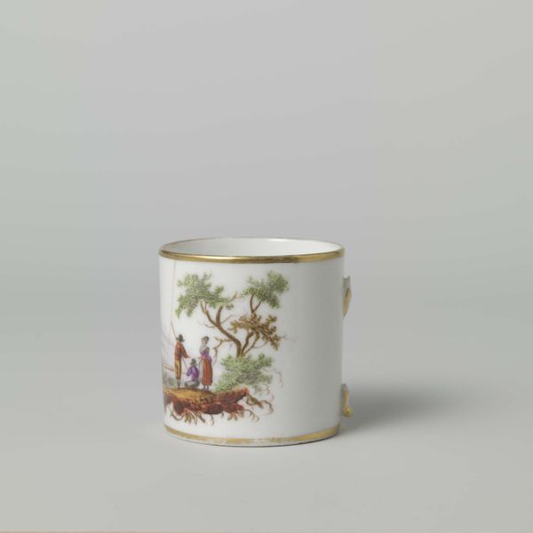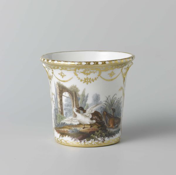 Curator: The Rijksmuseum holds this striking trio: three flowerpot containers crafted by the Loosdrecht manufactory between 1778 and 1782. Editor: They’ve got such a whimsical vibe! It's like stepping into a pastoral dream, all gilded edges and tiny painted scenes. I love the lighthearted touch of this kind of rococo. Curator: Exactly, the choice of porcelain here signifies not only refined taste, but a society eager to emulate aristocratic luxury. We can see it through the consumption of goods previously exclusive to royalty. Editor: Thinking about labor... Those miniature paintings must have been painstaking! Can you imagine the focus required to render each feather and floral detail? And the choice to show peacocks and chickens... It makes me think about domesticity versus exoticism, right there in your parlor. Curator: Porcelain production itself was an industrializing art, with complex division of labor. The decoration too—while seemingly frivolous—reflects developing artistic specialties, from painting to gilding. And those stands. Their modularity hints at serial production, even in these handcrafted luxury objects. Editor: It is a dance of class aspiration. The craftsmanship elevates functional objects into works of art. Do you think whoever owned these saw their drawing-room reflected in these tiny scenes? A touch of countryside, safely contained? Curator: Likely so. These vessels would have functioned not merely as holders for flora, but as visible markers of social standing and cultivated sensibility. A way of displaying engagement with aesthetic values of the period, and an understanding of decorative arts. Editor: Looking at them now, separated from the soil and plants, it is hard not to admire how seamlessly artistry melts into production. I really could get lost gazing at each little scene painted around them! Curator: Well, by examining these elegant vessels we have found so much social commentary held in those details. Thank you for joining me as we pulled apart how these little objects have larger stories to tell!